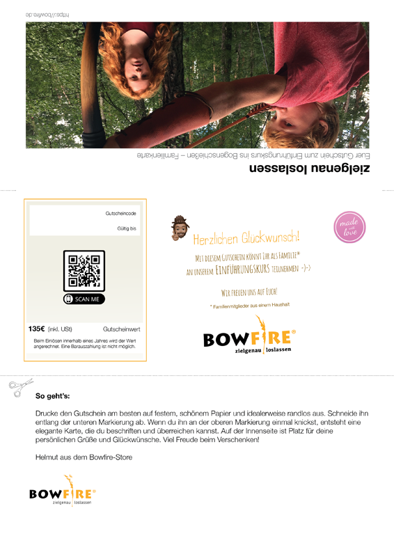 Der BOWFIRE® Geschenkgutschein kann sowohl online als auch vor Ort eingelöst werden: bei Bestellungen über unsere Webseite, beim Besuch eines (Bogenbau-)Workshops oder direkt in unserem Trailstore. Du entscheidest selbst, welches Format passt – wahlweise in einer eleganten Klappkarte oder als praktisches PDF. Ideal für jede Gelegenheit: als festliches Geschenk, schnelle Aufmerksamkeit oder spontane Überraschung.