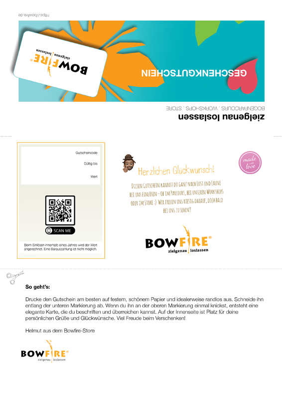 Der BOWFIRE® Geschenkgutschein kann sowohl online als auch vor Ort eingelöst werden: bei Bestellungen über unsere Webseite, beim Besuch eines (Bogenbau-)Workshops oder direkt in unserem Trailstore. Du entscheidest selbst, welches Format passt – wahlweise in einer eleganten Klappkarte oder als praktisches PDF. Ideal für jede Gelegenheit: als festliches Geschenk, schnelle Aufmerksamkeit oder spontane Überraschung.