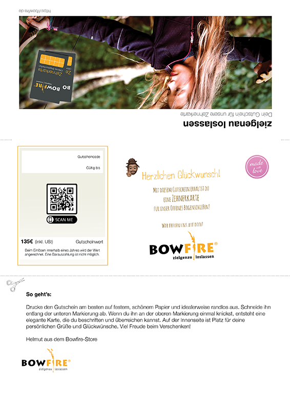 Der BOWFIRE® Geschenkgutschein kann sowohl online als auch vor Ort eingelöst werden: bei Bestellungen über unsere Webseite, beim Besuch eines (Bogenbau-)Workshops oder direkt in unserem Trailstore. Du entscheidest selbst, welches Format passt – wahlweise in einer eleganten Klappkarte oder als praktisches PDF. Ideal für jede Gelegenheit: als festliches Geschenk, schnelle Aufmerksamkeit oder spontane Überraschung.