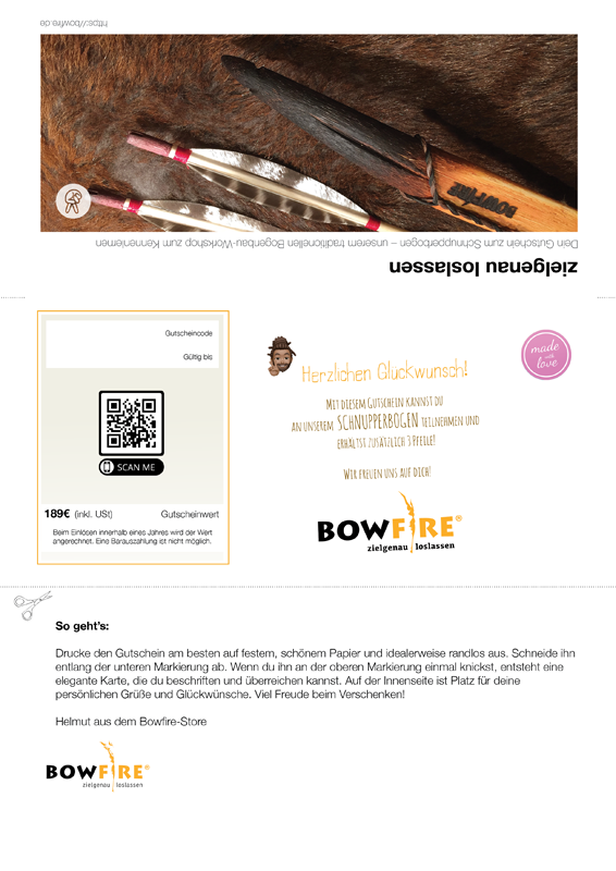 Der BOWFIRE® Geschenkgutschein kann sowohl online als auch vor Ort eingelöst werden: bei Bestellungen über unsere Webseite, beim Besuch eines (Bogenbau-)Workshops oder direkt in unserem Trailstore. Du entscheidest selbst, welches Format passt – wahlweise in einer eleganten Klappkarte oder als praktisches PDF. Ideal für jede Gelegenheit: als festliches Geschenk, schnelle Aufmerksamkeit oder spontane Überraschung.