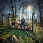 Mit einer Mega-Leiter installierte er in den hohen Buchen zwei pendelnde Kugeln mit Hilfe eines Seilsystems. Die beiden schweren Rinehart Kugeln sind miteinander verbunden und übertragen ihre Energie jeweils auf die andere. Dadurch halten sie sich in Bewegung 🙂